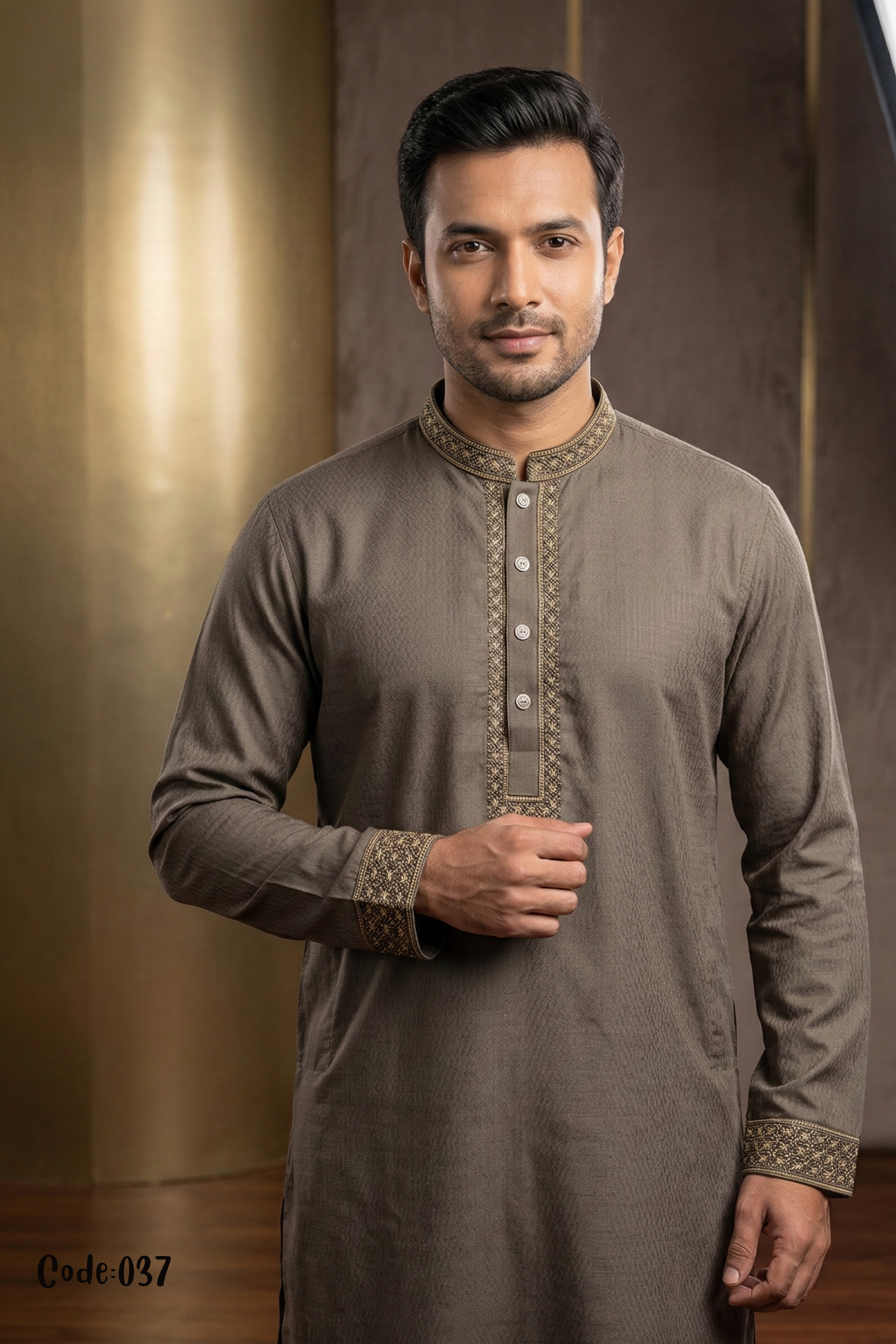 The design is centered around luxurious gold-thread embroidery, meticulously applied to the band collar and the full length of the visible button placket. The wide, embroidered cuffs add a final touch of traditional grandeur.