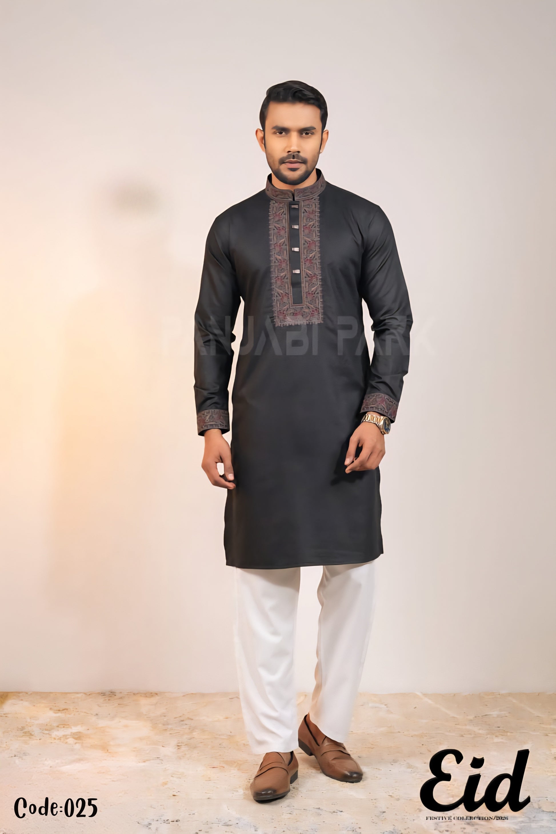 Make a lasting impression this Eid with our Onyx Black Panjabi. Featuring elaborate embroidery on a deep black canvas, this piece is the perfect blend of traditional craftsmanship and bold, modern style.
