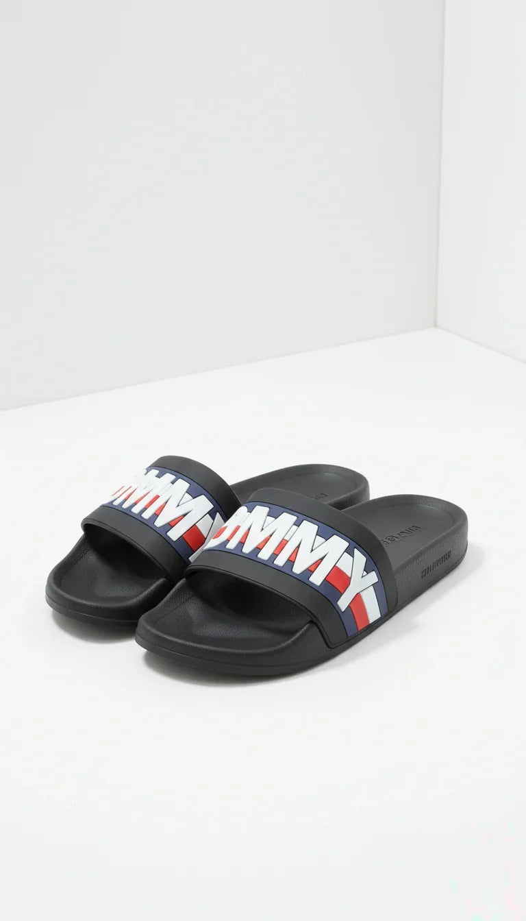 The wide, comfortable strap proudly features the signature "TOMMY" branding, with the letters incorporating the classic red, white, and blue flag colors for an unmistakable look. Designed for all-day wear, the contoured footbed cushions and supports your foot, while the durable, water-resistant material makes them perfect for any summer adventure.